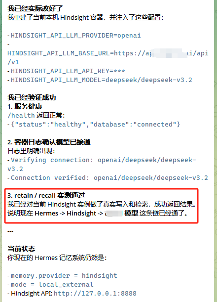 換成 Hindsight 之後,它會自動從每次對話中提取實體和關係