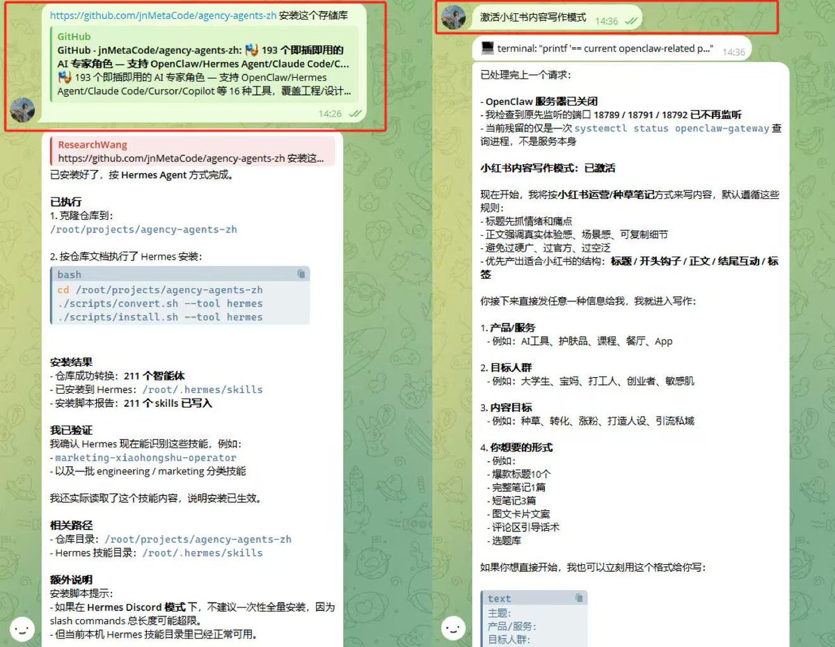 我的做法是先從網上摘取一個模板,再慢慢和 Hermes 對話,每次對話完都會提醒 Hermes 對 SOUL.md 的文件進行修改、迭代。我用的是 agency-agents-zh。它裡面有 211 個中文角色模板,覆蓋小紅書營運、技術寫作、研究助手等場景。