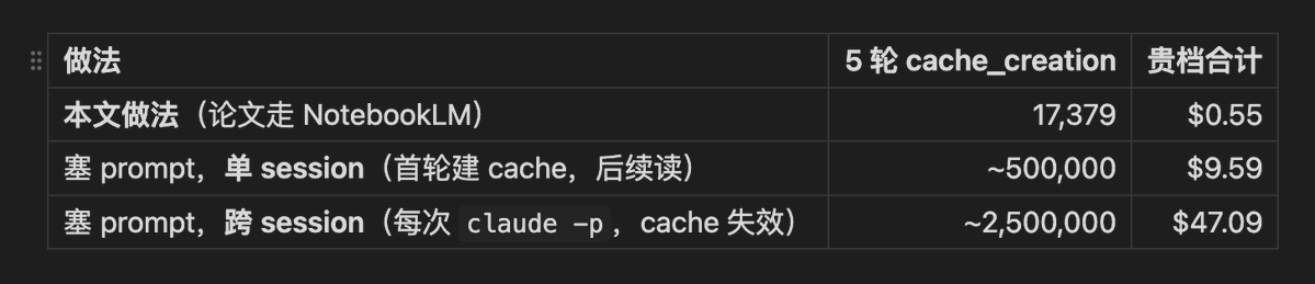 本文做法裡論文壓根不進 Claude,cache 命不命中都無所謂。