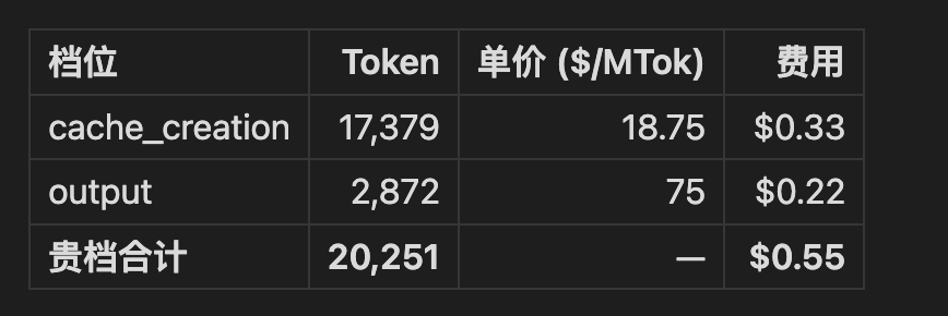 真正決定帳單的是 token input + cache_creation(往快取寫新內容)和 output(生成)。便宜檔(cache_read + input)單價不到它們的 1/10,這裡忽略,只算貴檔: