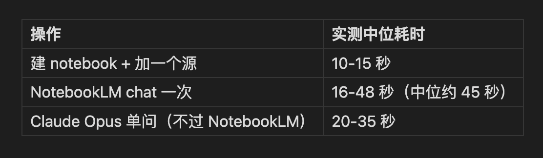 操作 實測中位耗時 建 notebook + 加一個源 10-15 秒 NotebookLM chat 一次 16-48 秒(中位約 45 秒) Claude Opus 單問(不過 NotebookLM) 20-35 秒