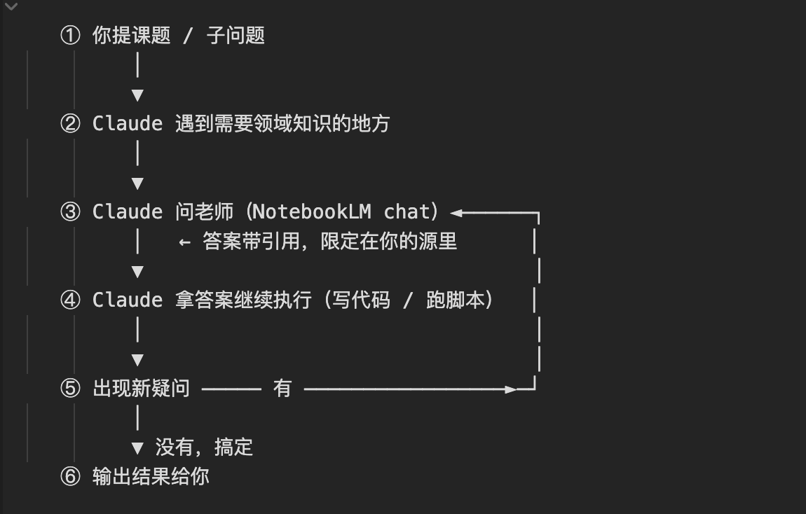 NotebookLM 是老師:你親自採集進去的論文、財報、筆記形成它的知識庫。你問它,它答經驗,答案帶引用,邊界在源內,不亂外推。Claude 是助手:負責寫程式碼、跑腳本、整理結果、編排工具。不懂就去問老師,拿到答案繼續幹活。你是課題負責人:只在關鍵決策點介入。