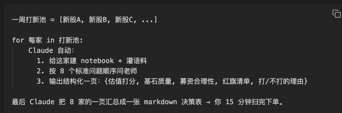 一週打新池 5-8 家 = 40-64 次查詢,全程論文(這裡是招股書)不進 Claude 對話——單本招股書 150-250k token,5 家就是 100 萬 token 的語料量,傳統做法光這一項一週就能燒掉 $50+。走本文做法 $2 以內。