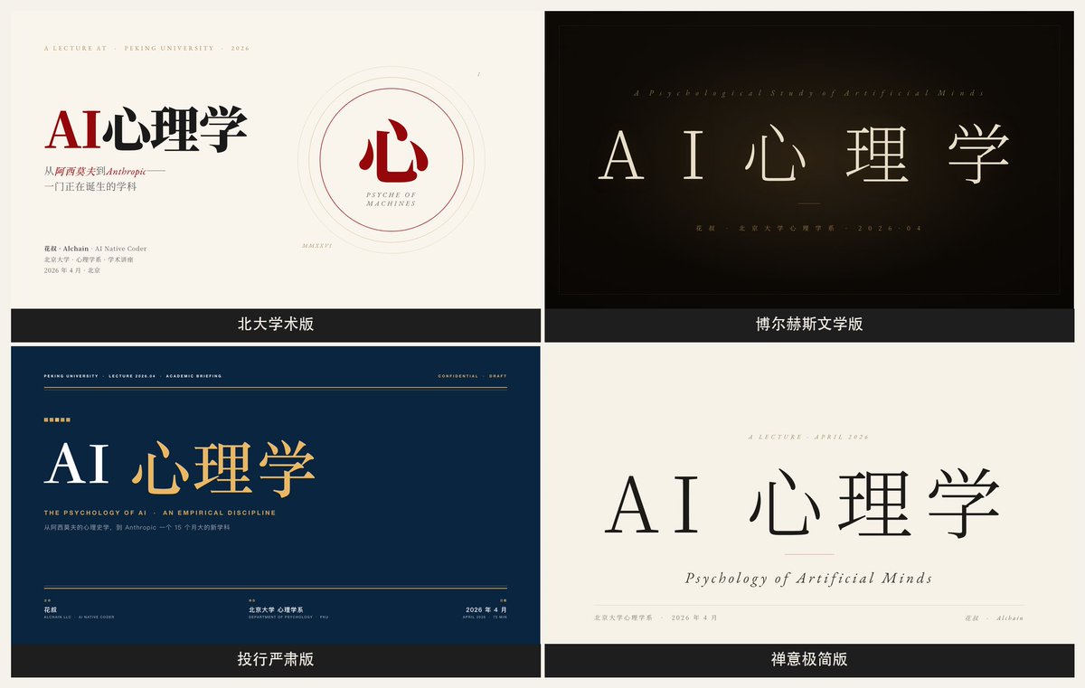 huashu-design 啟動了它的「設計方向顧問模式」。從 20 種預置的設計哲學裡(Pentagram 的資訊建築、Field.io 的運動詩學、Kenya Hara 的東方極簡、Sagmeister 的實驗先鋒……),挑出 4 個互相差異最大的方向,然後並行啟動 4 個 Agent,各自做了一套完整的演講 PPT。