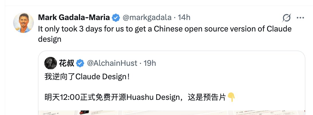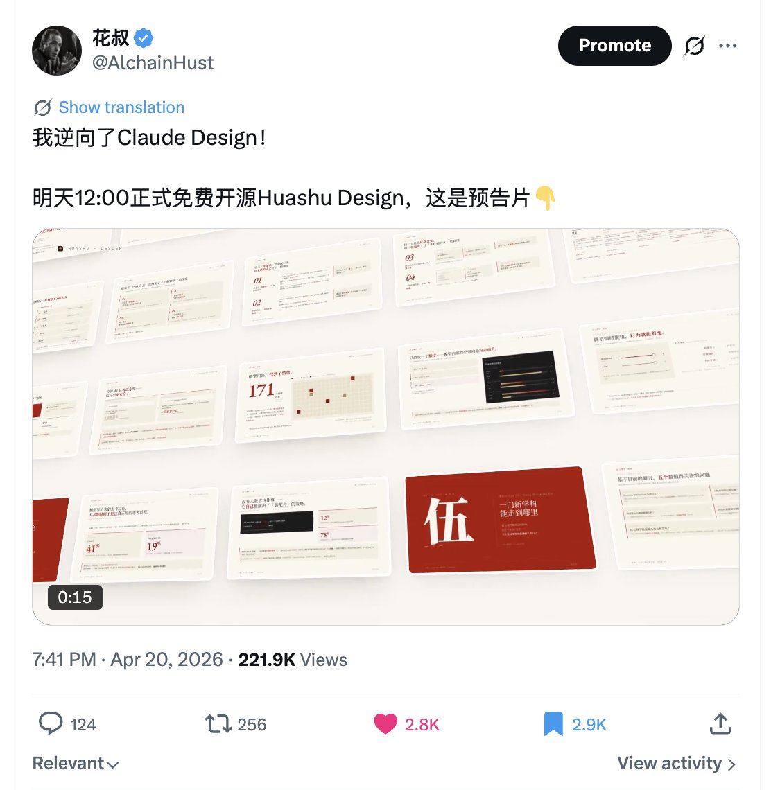 我昨晚在 X 上發了一則我要開源「Huashu Design」的預告,現在已經有 20 多萬次閱讀了。