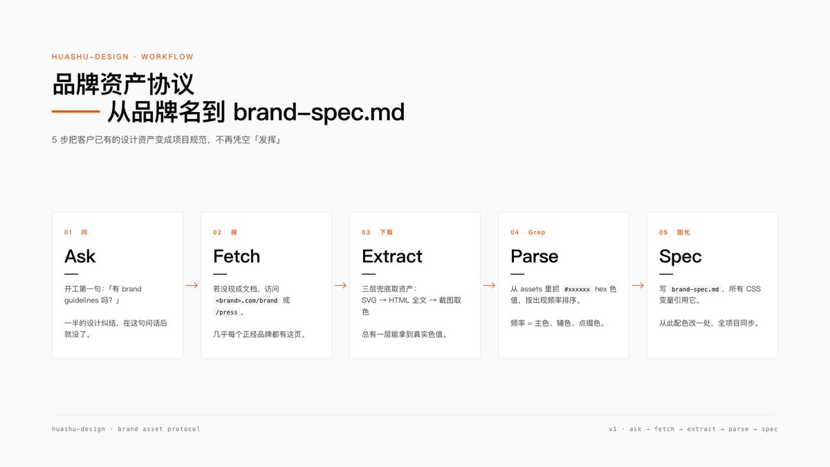 #xxxxxx的 6 位 hex,按頻率排序,過濾黑白灰。這裡有個反直覺的點:產品截圖裡常有使用者演示的其他品牌色(比如某個工具的截圖裡在演示喜茶紅),那不是這個工具本身的色。同時出現兩種強色時必須區分。 - Step 5 · 固化為 brand-spec.md。前四步抽完的色值,如果只留在記憶裡,下一頁就忘。必須寫一份 spec 文件到專案根目錄,讓所有 CSS 變數引用這份文件。
