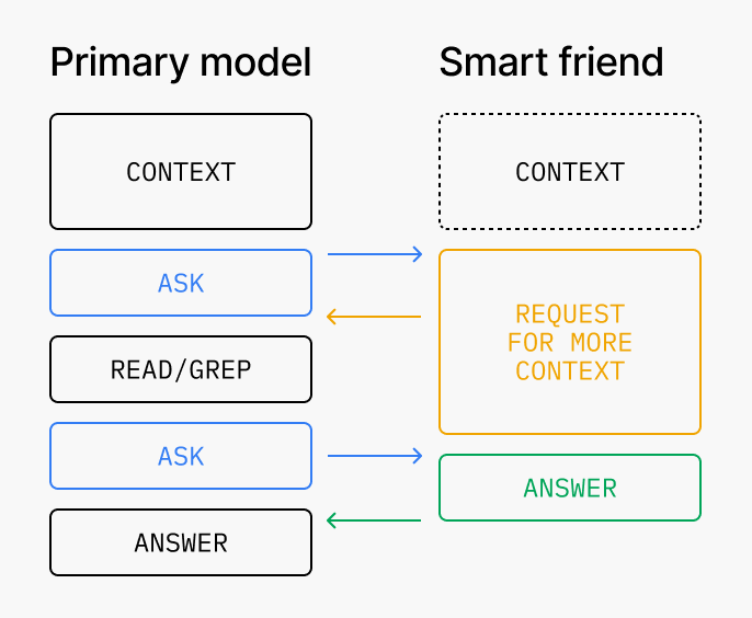 我們實現這一點的實際架構是:將更聰明/更強大的模型作為一個「Smart Friend」工具,供主要/較小的模型呼叫。基本上,讓主要/較小的模型決定何時情況足夠棘手,值得諮詢更聰明/昂貴的模型。但我們很快發現,設計 context 傳輸和溝通非常棘手: