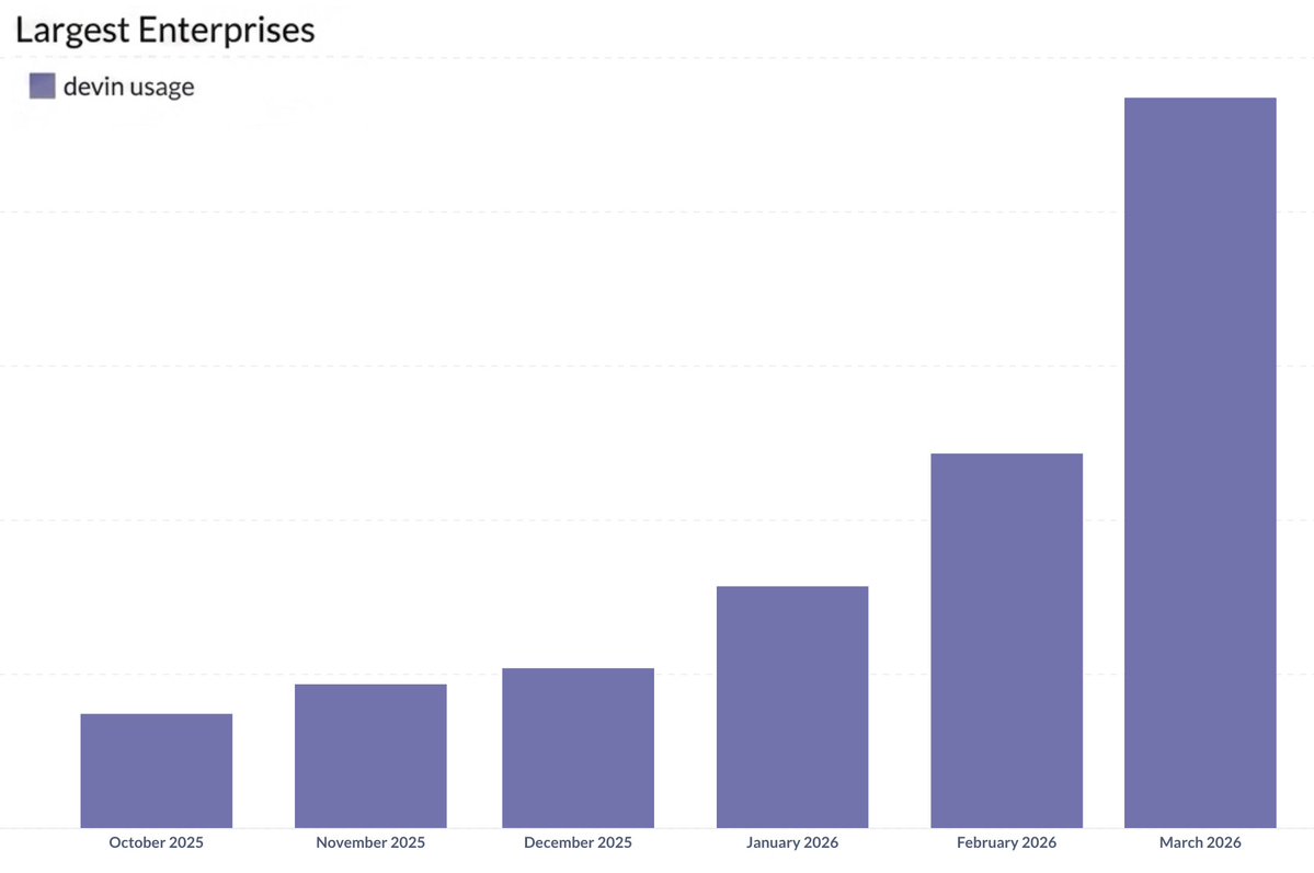 首先,模型已經變得更加「Agent 化(agentic)」。它們能直觀地理解工具使用、自身的 context 限制,以及如何為協作者(無論是人類還是其他 Agent)提煉 context。結果就是,Agent 的使用量出現了……驚人的成長。即使觀察我們最大型企業客戶群體中 Devin 的使用情況(這類客戶通常對採用新技術持謹慎態度),我們也看到了過去 6 個月內出現了爆炸性成長(約 8 倍)。